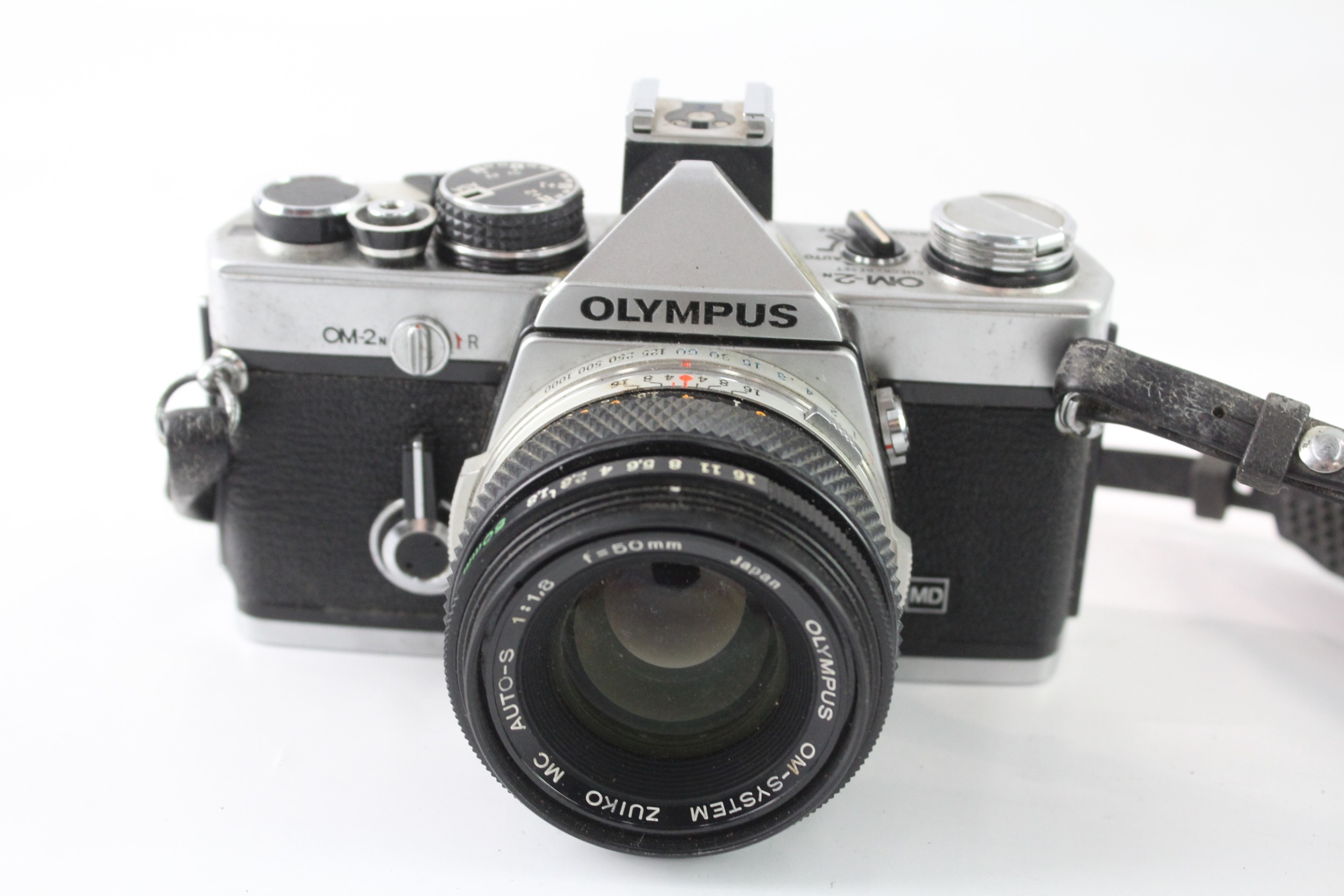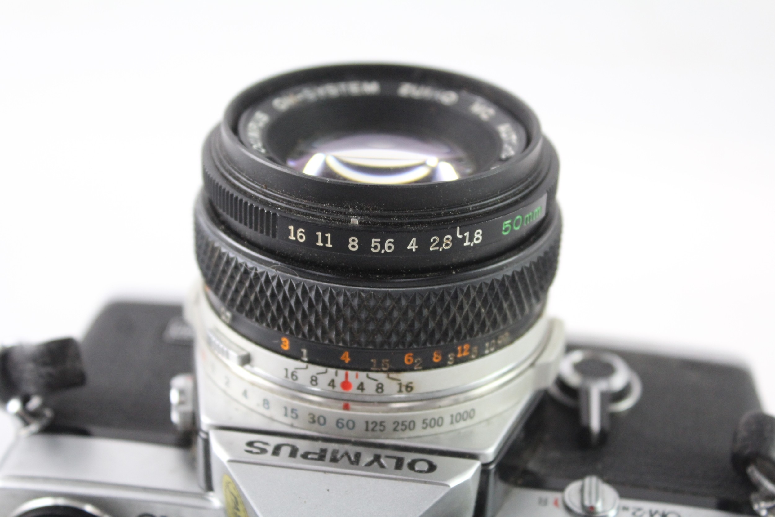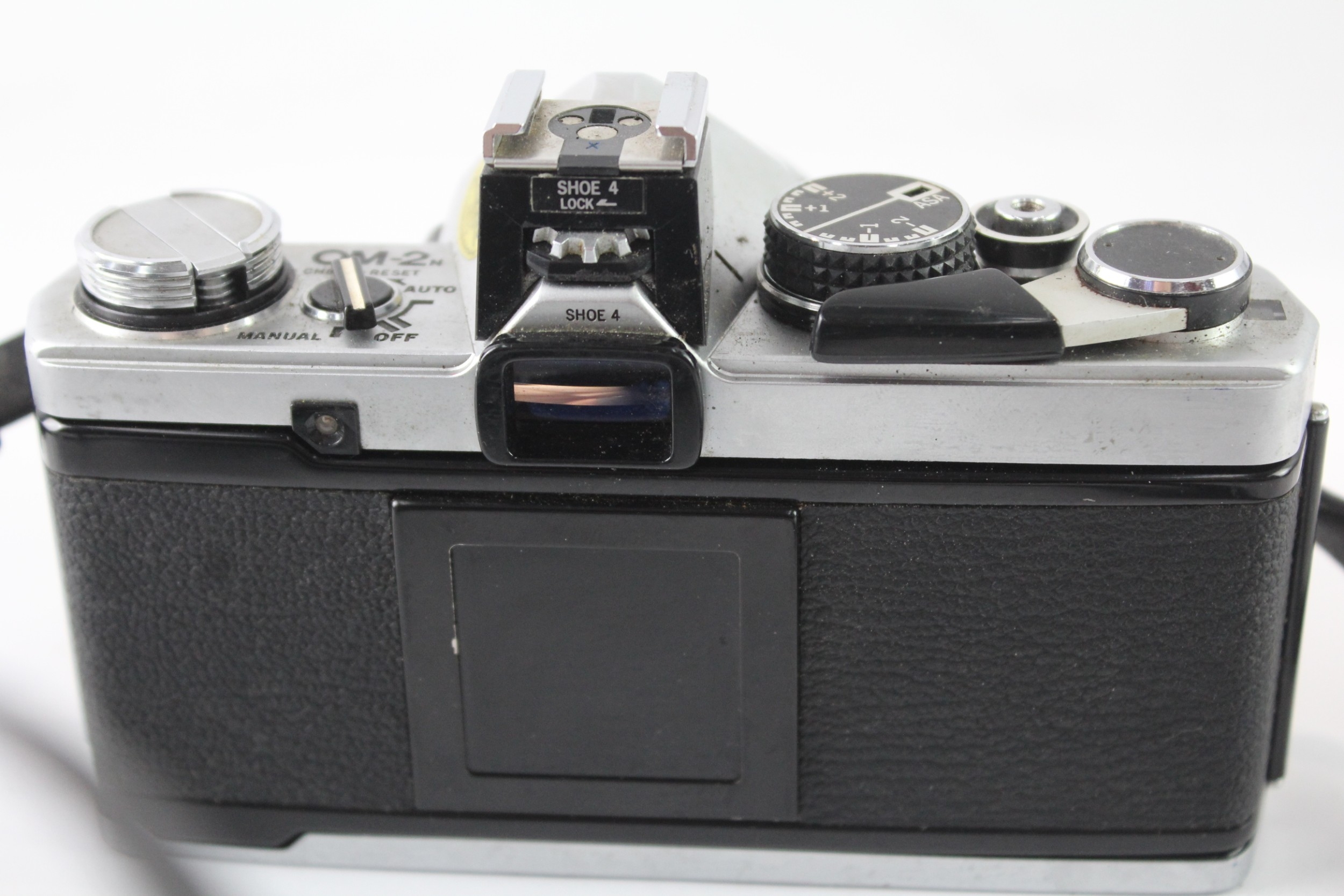 An Olympus OM-2N MD 35mm SLR camera fitted with Zuiko MC Auto-S 1:1.8 50mm lens