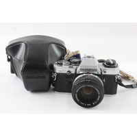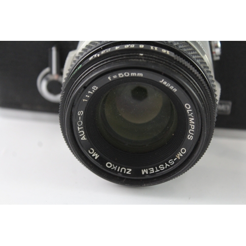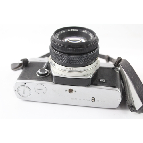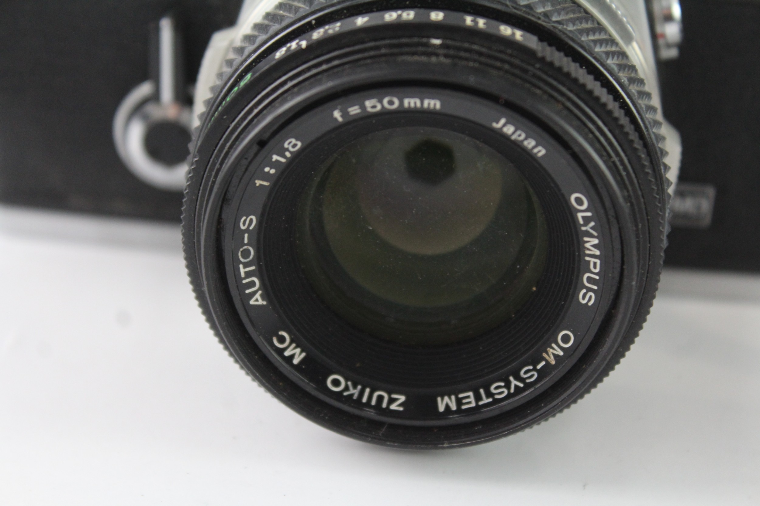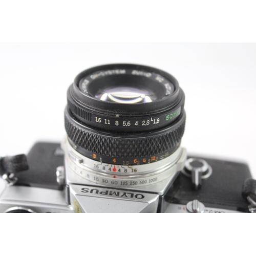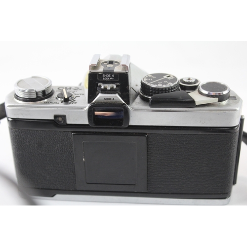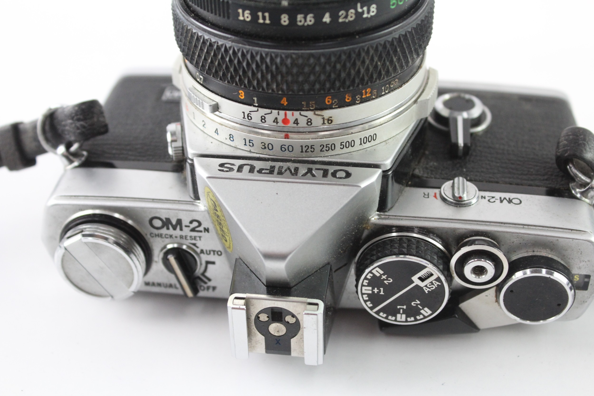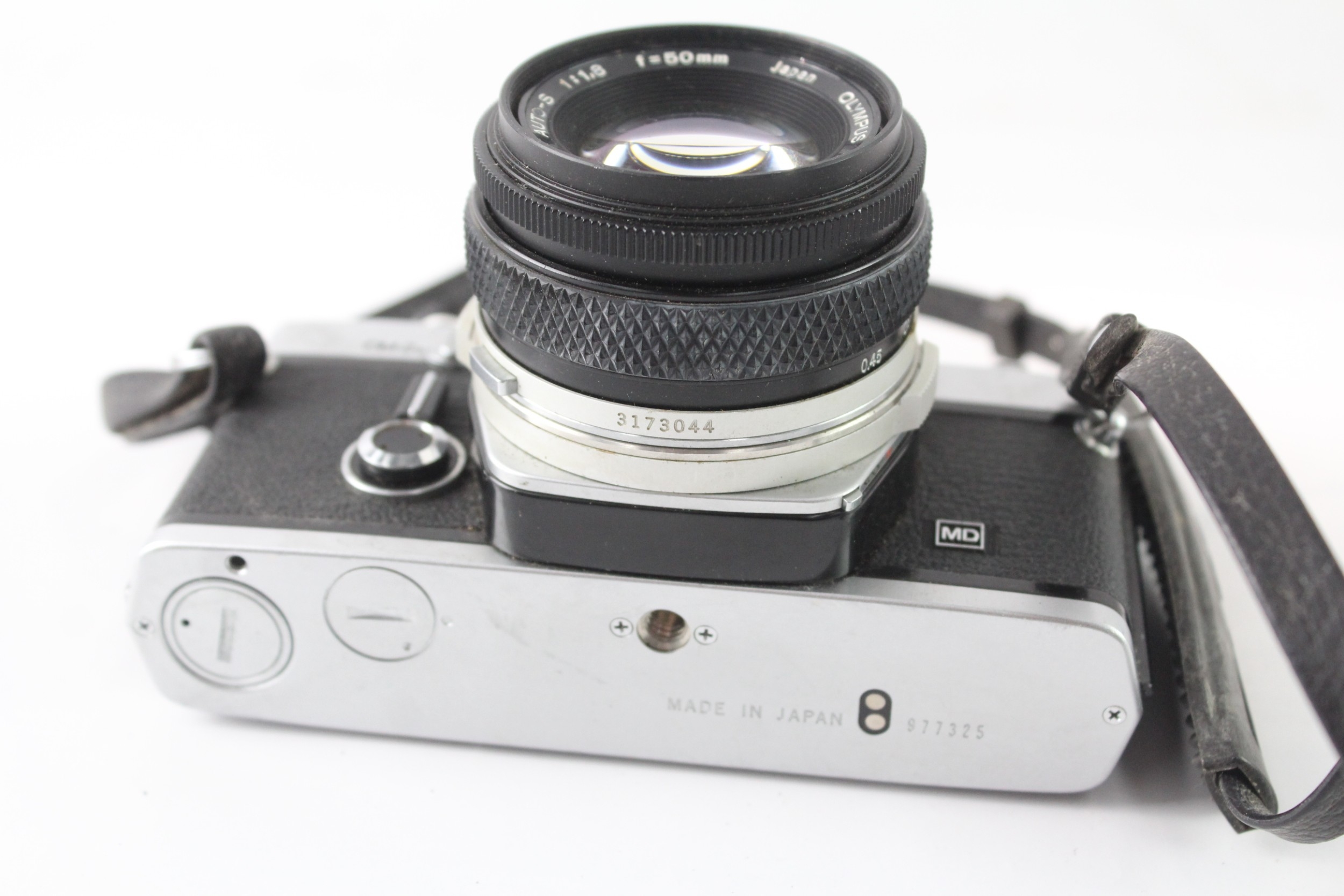 An Olympus OM-2N MD 35mm SLR camera fitted with Zuiko MC Auto-S 1:1.8 50mm lens