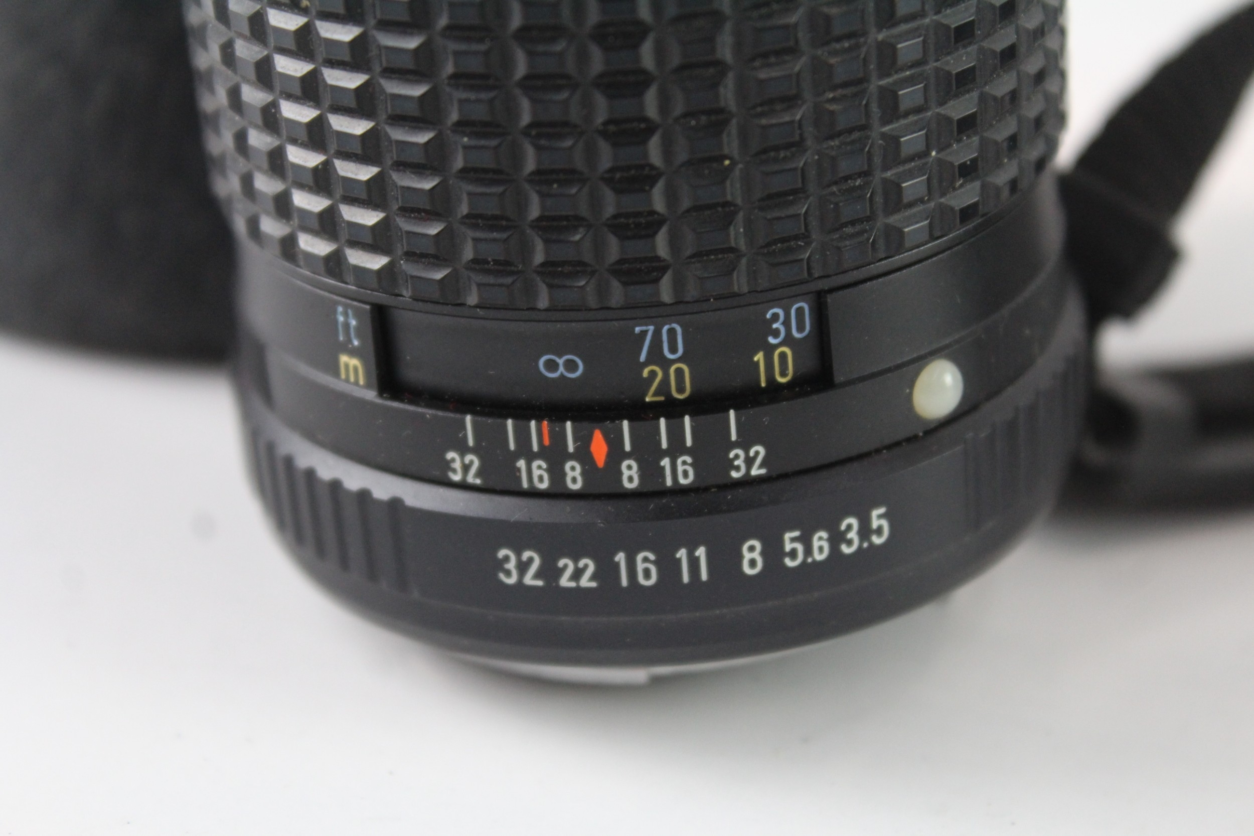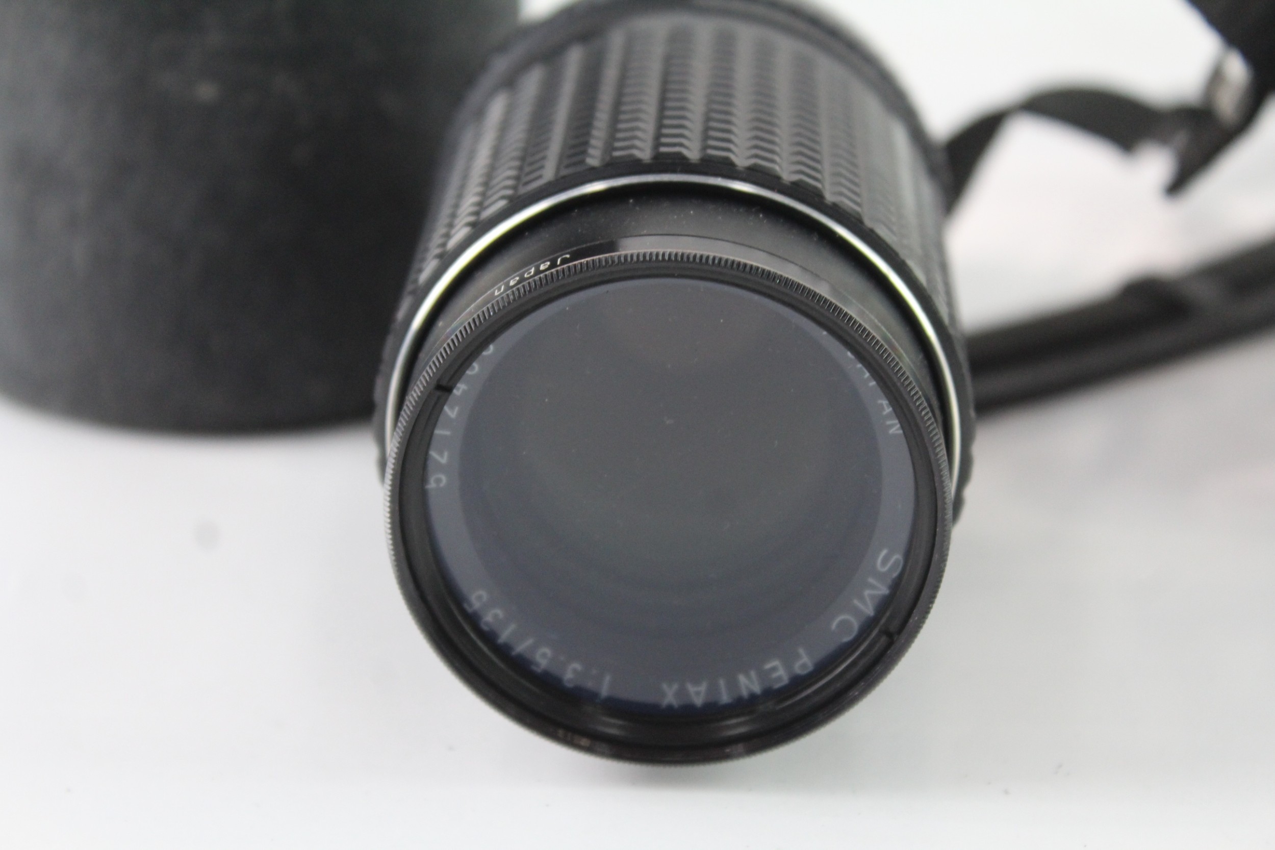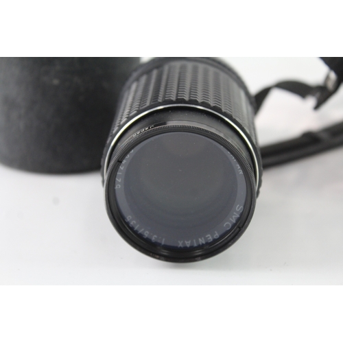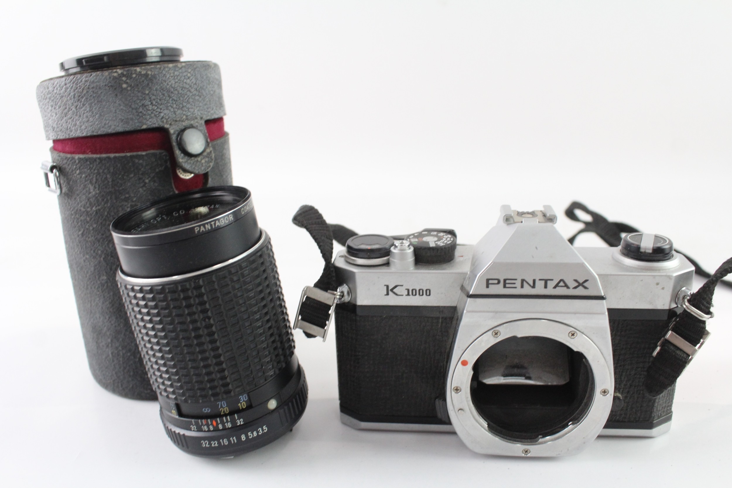 A Pentax K1000 35mm SLR camera with cased SMC Pentax 1:3.5 135mm lens with caps