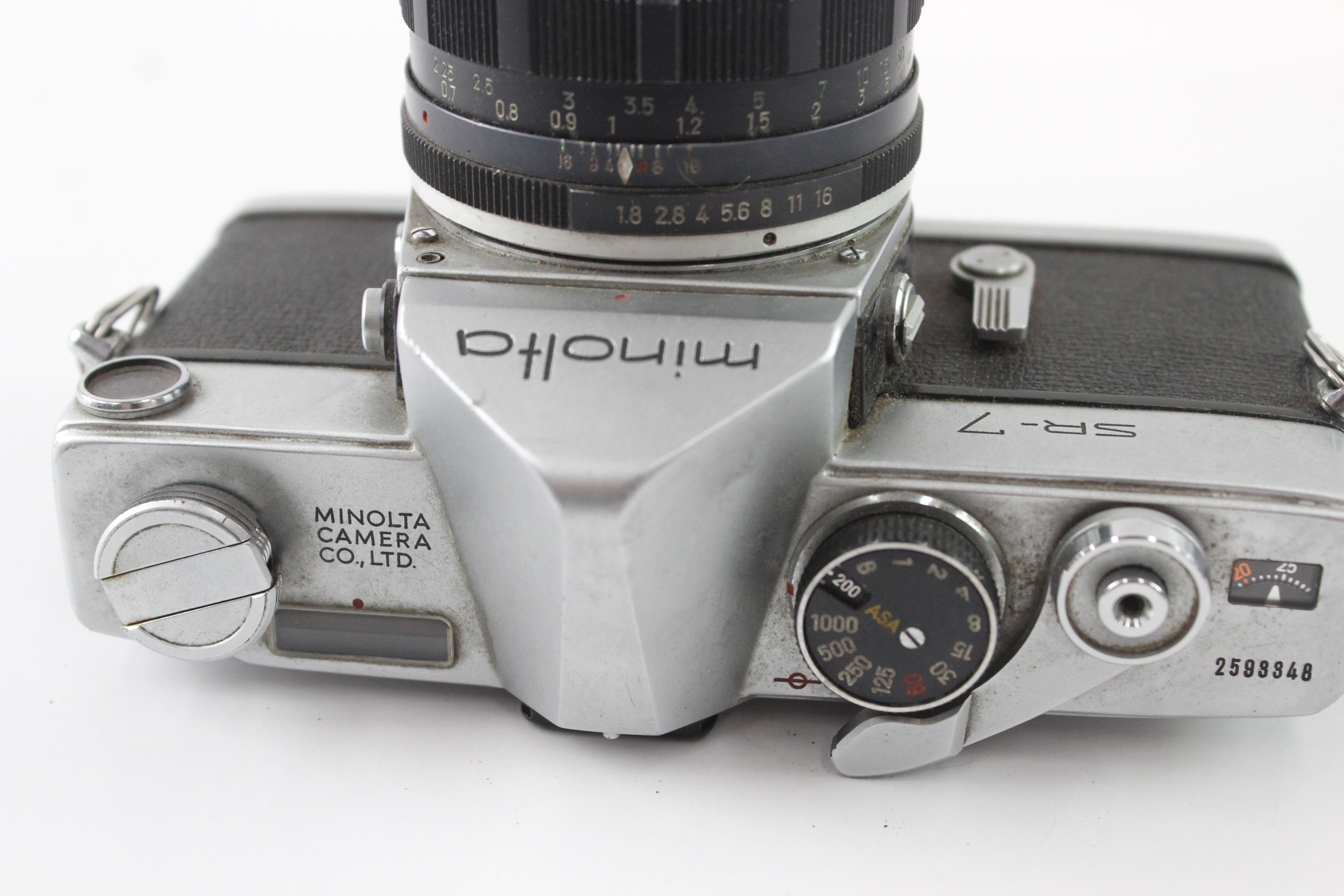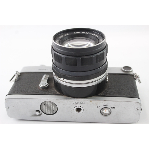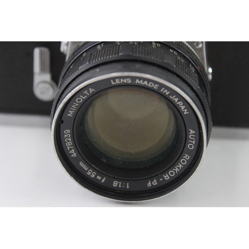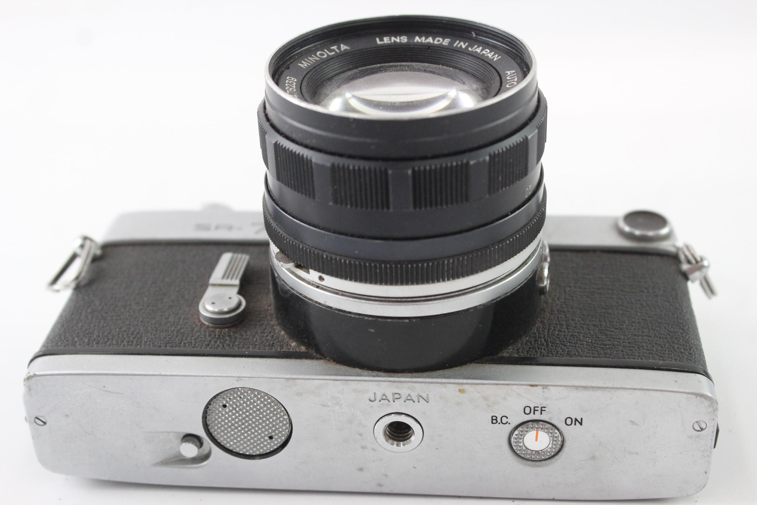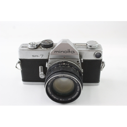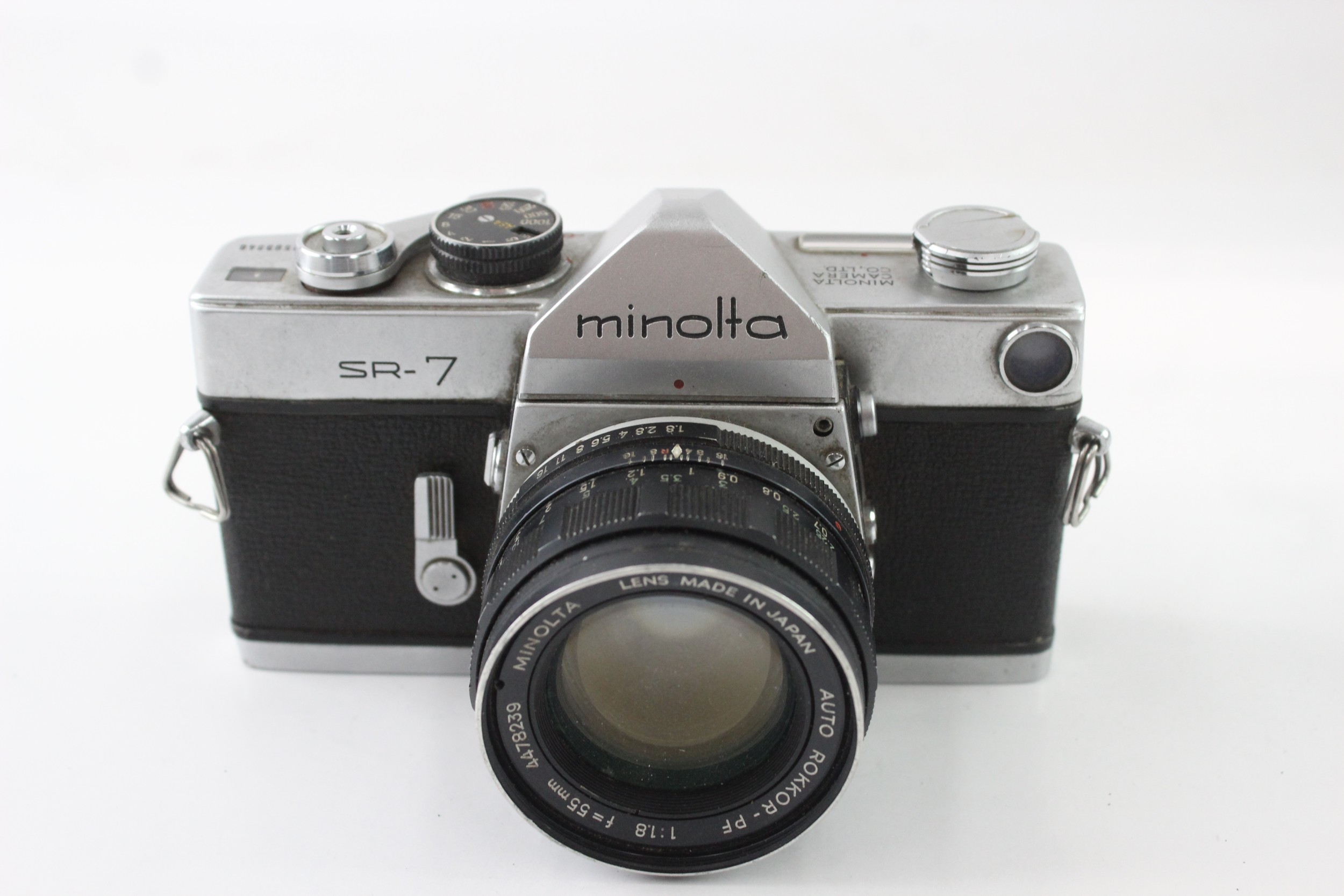 A Minolta SR-7 (Model V) 35mm SLR camera fitted with Auto Rokkor-PF 1:1.8 55mm lens with caps
