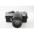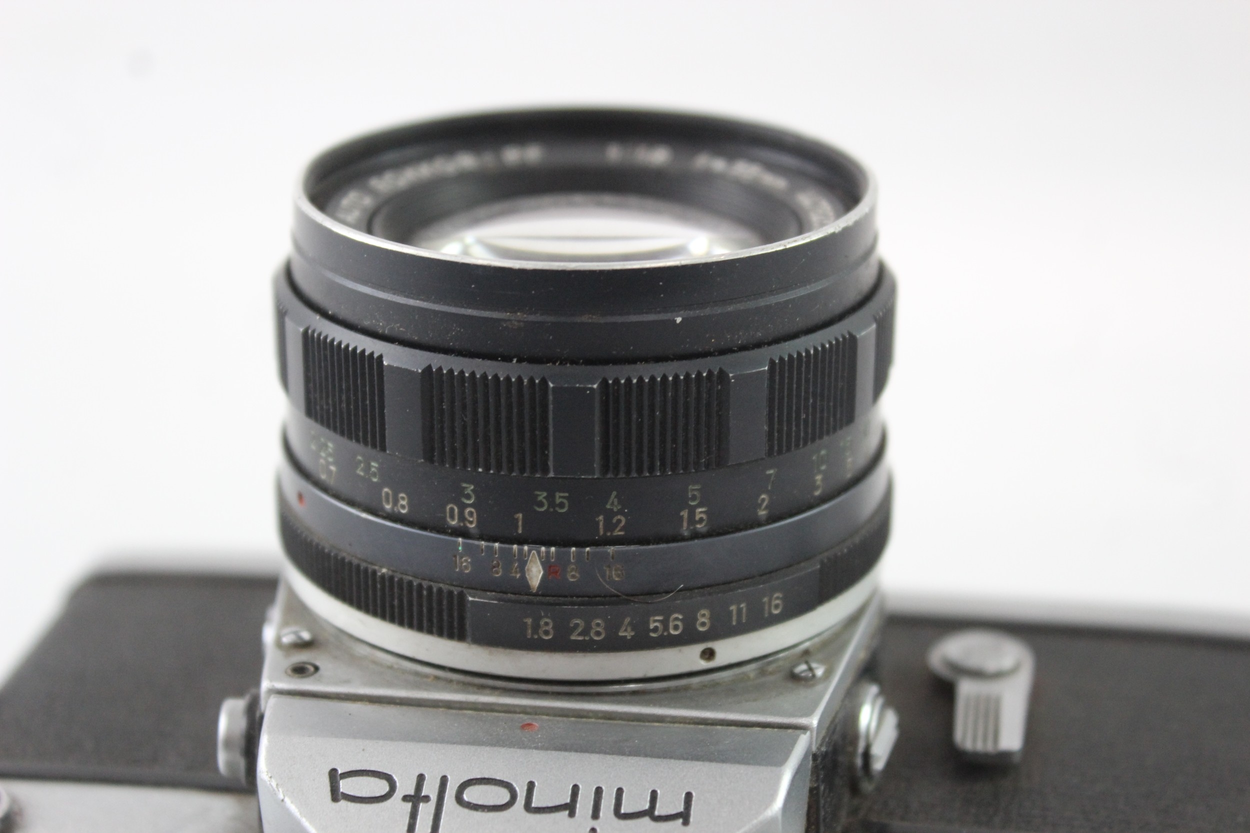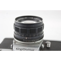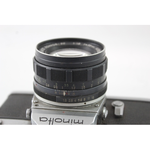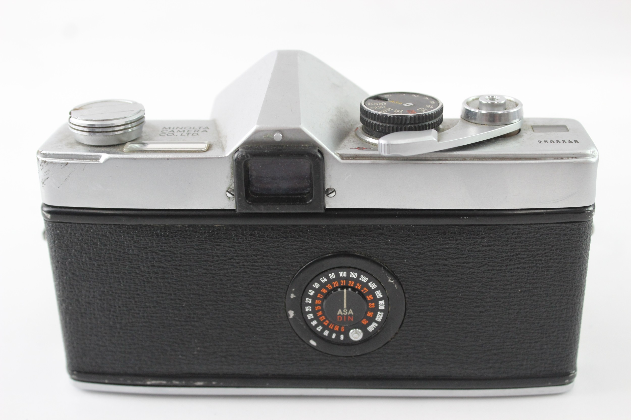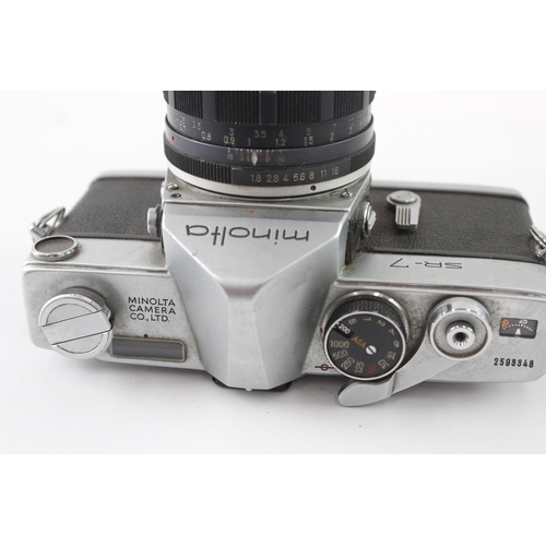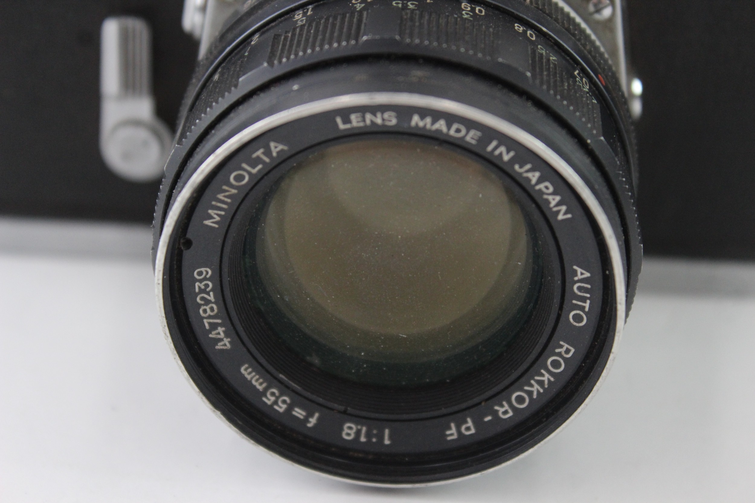 A Minolta SR-7 (Model V) 35mm SLR camera fitted with Auto Rokkor-PF 1:1.8 55mm lens with caps