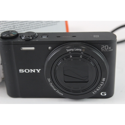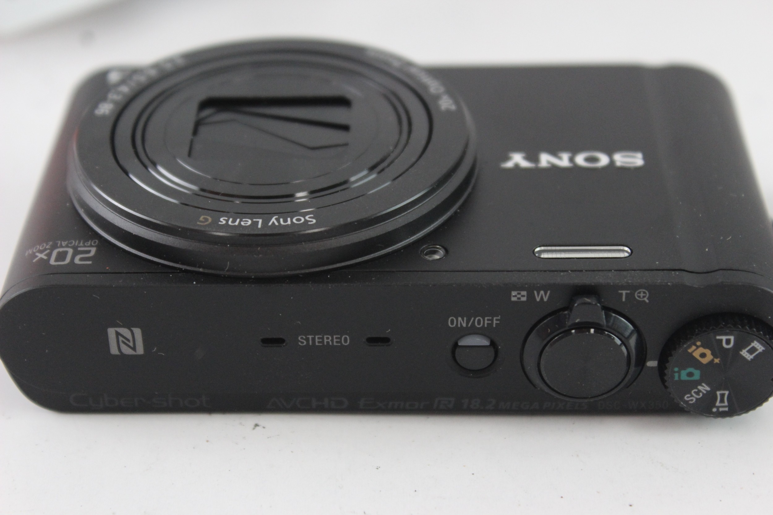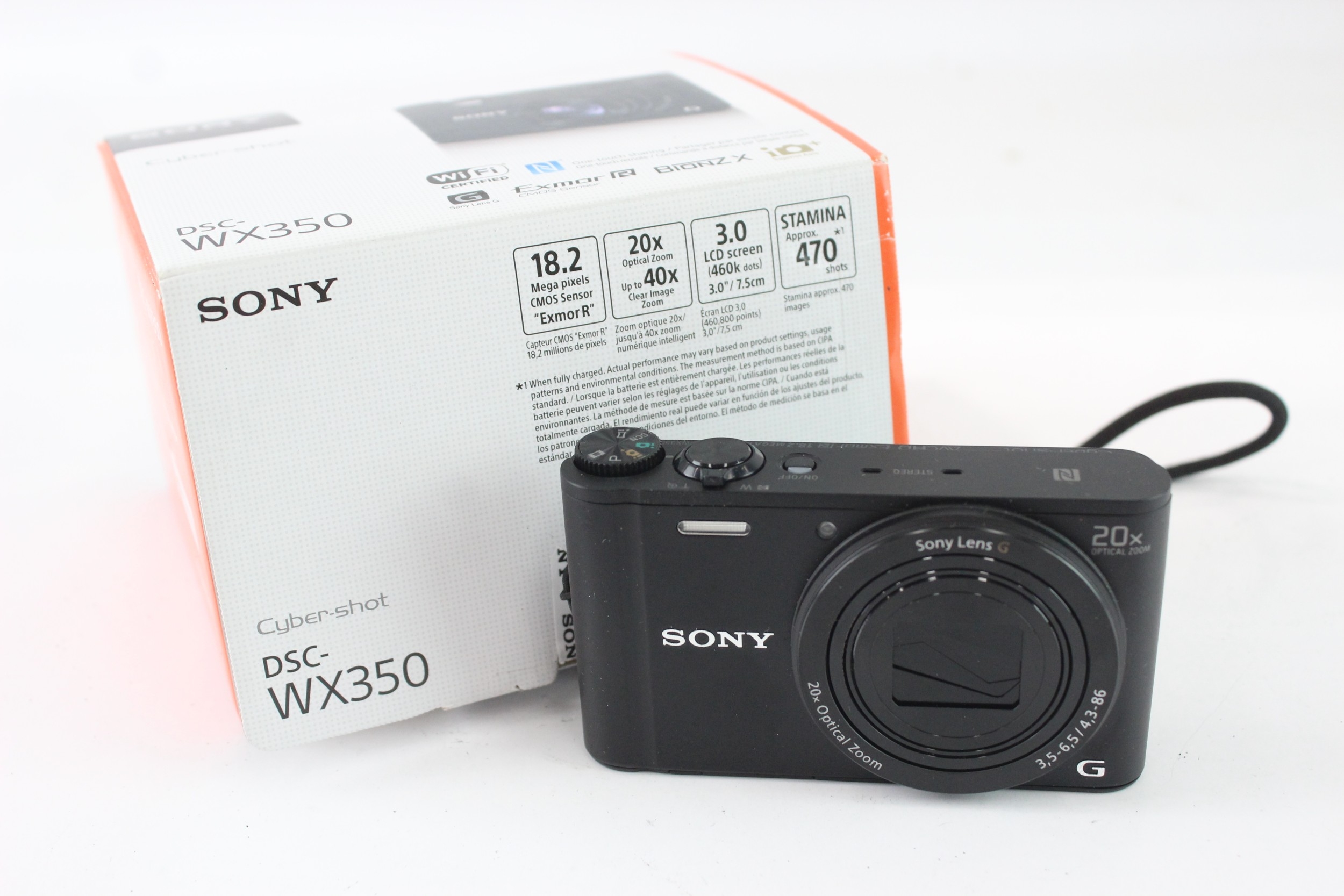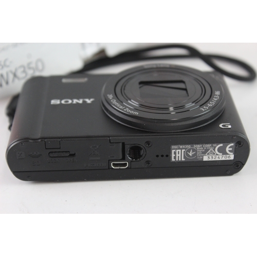 A boxed Sony Cyber-shot DSC-WX350 18.2mp Exmor-R CMOS sensor compact digital camera with charger and instruction manual