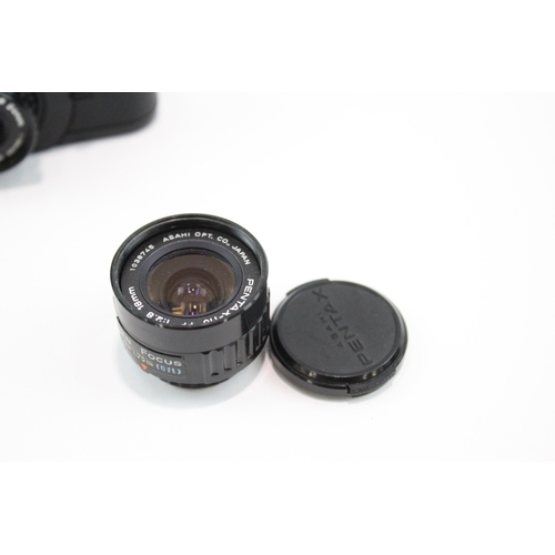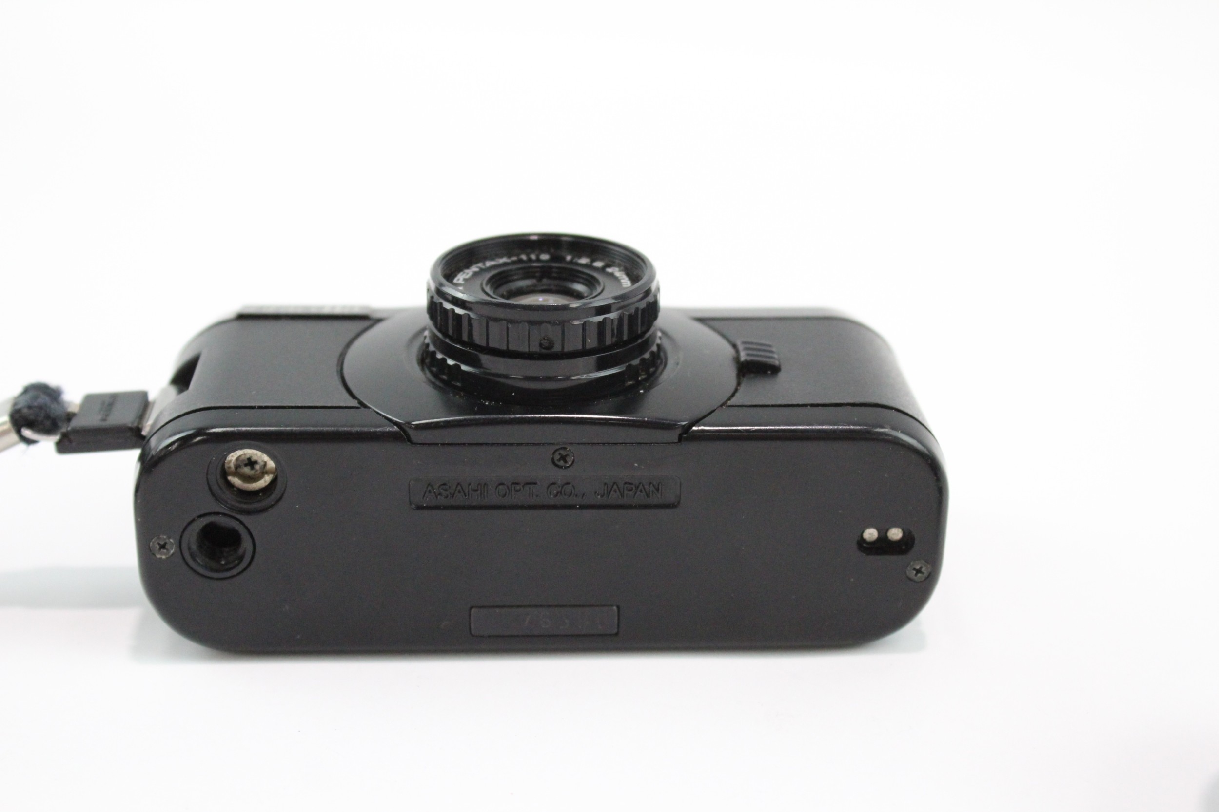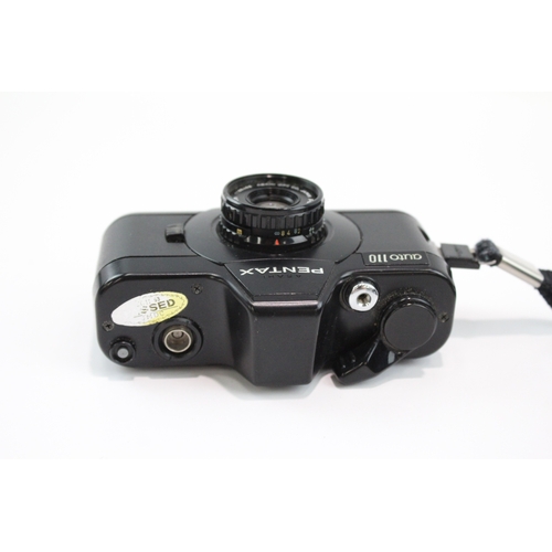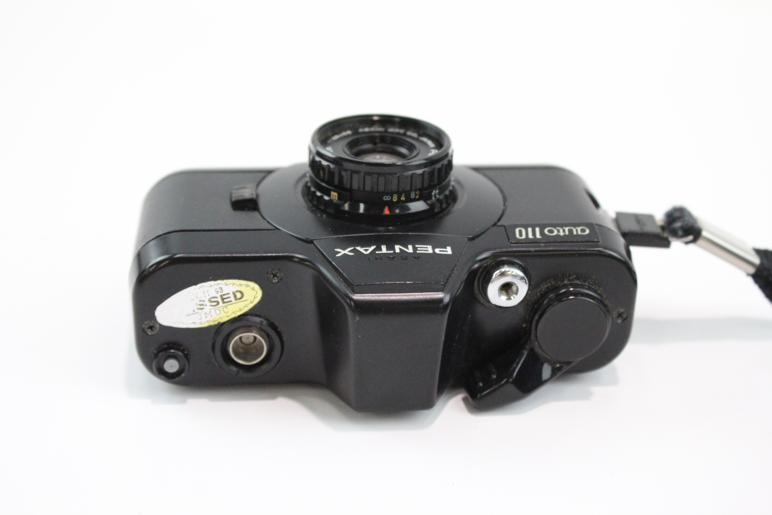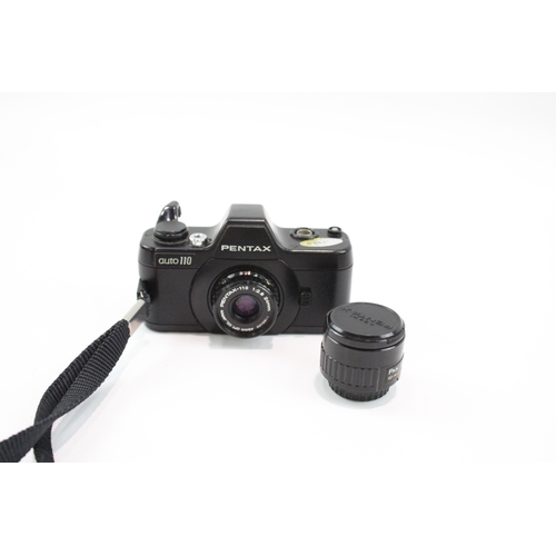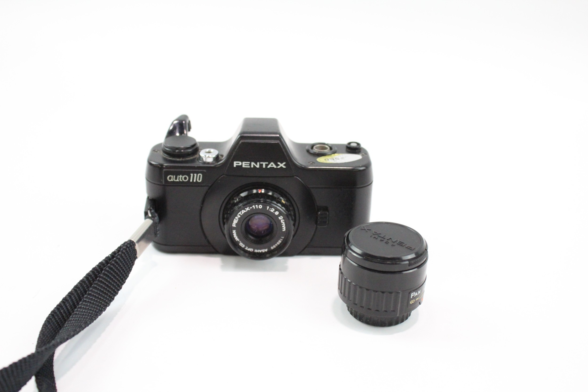An Asahi Pentax Auto 110 SLR camera for 110 film fitted with 1:2.8 24mm lens with Pentax-110 PF 1:2.8 18mm lens