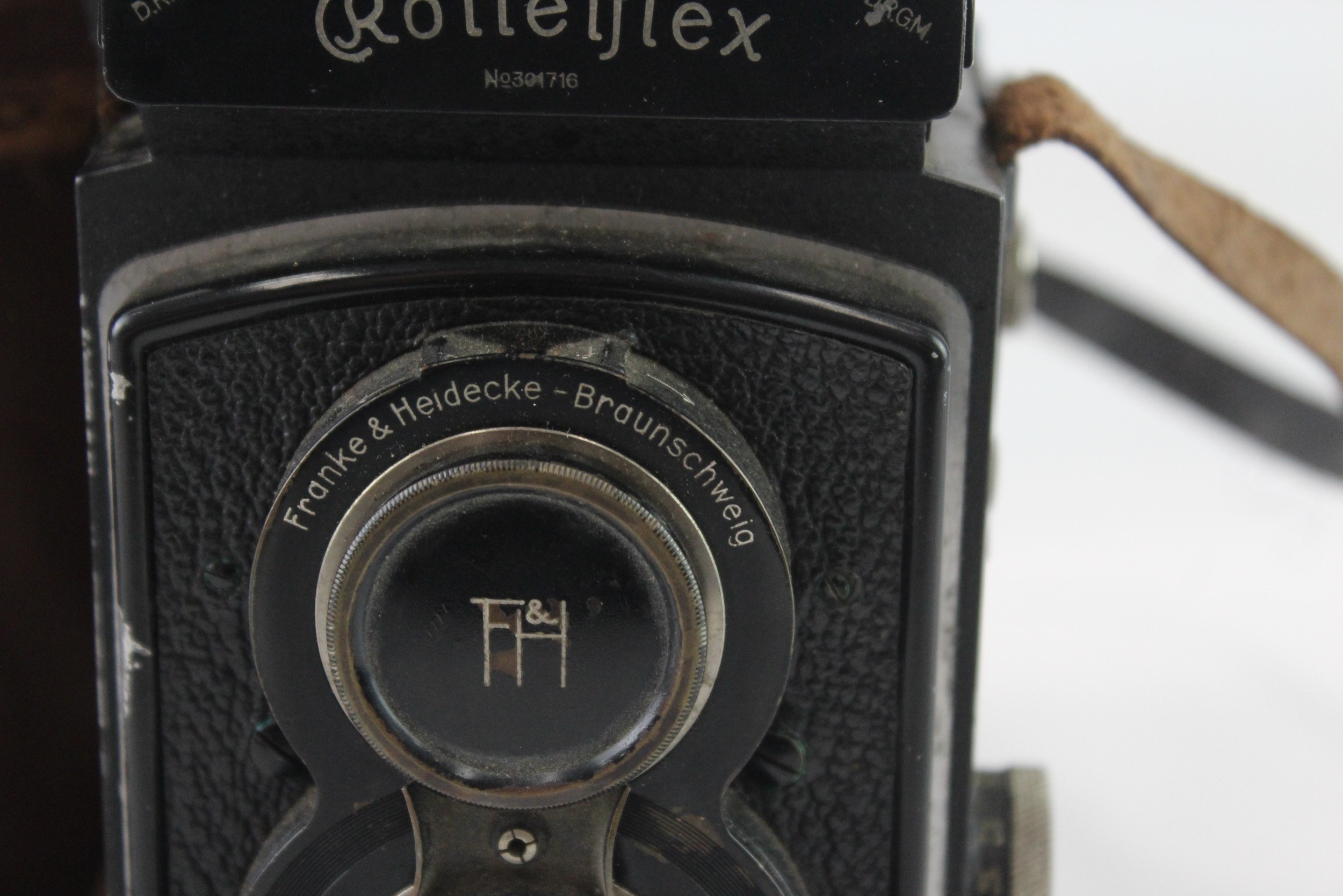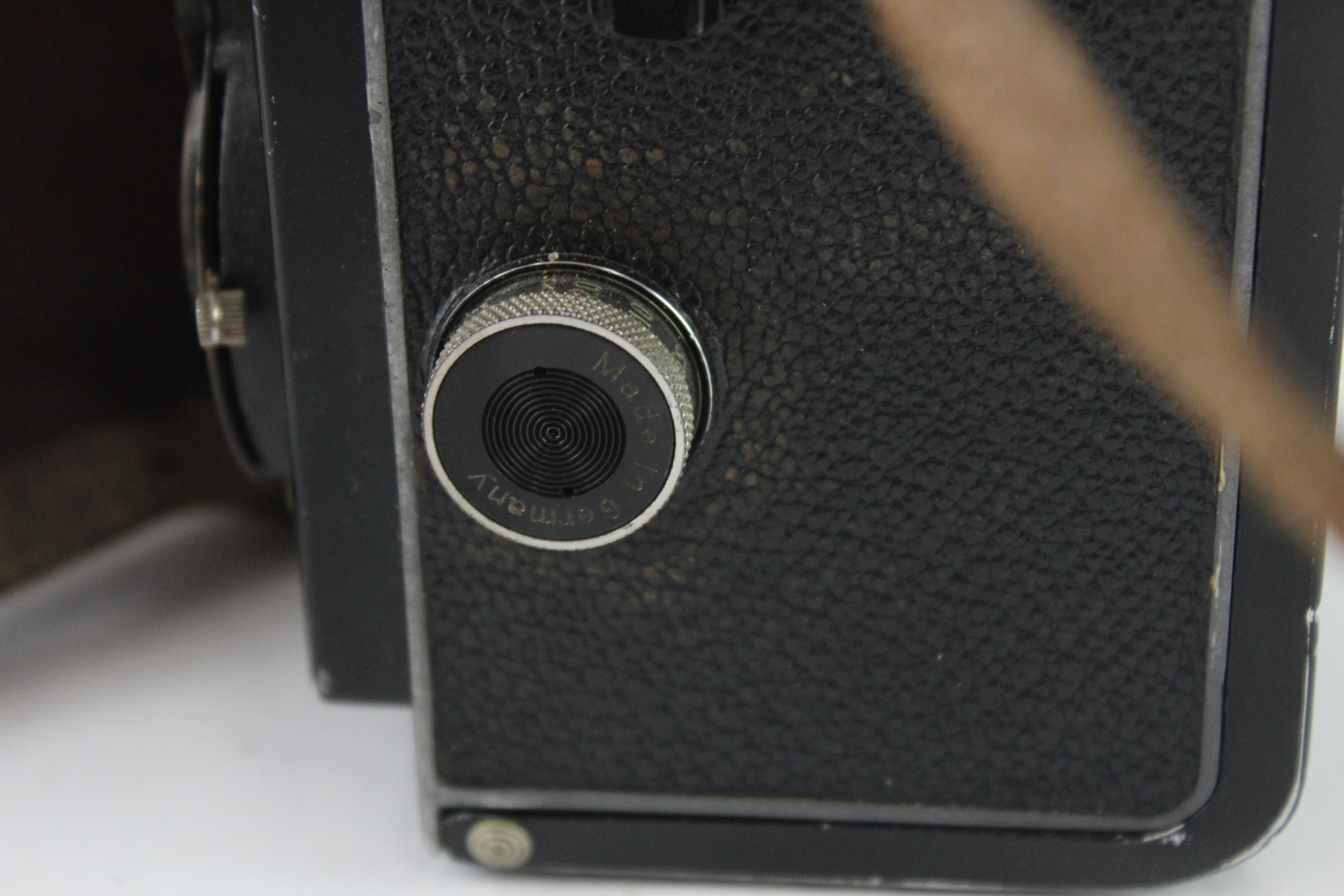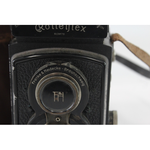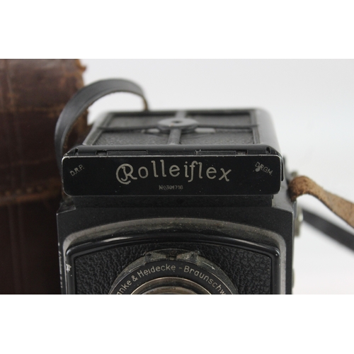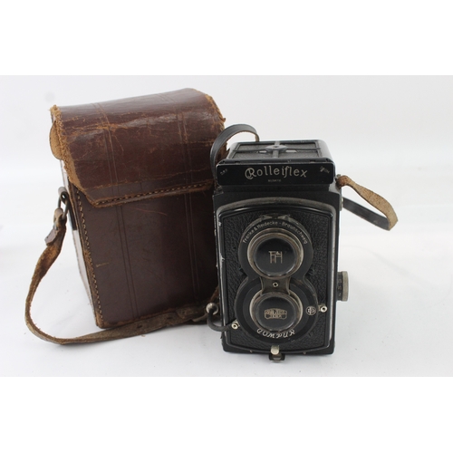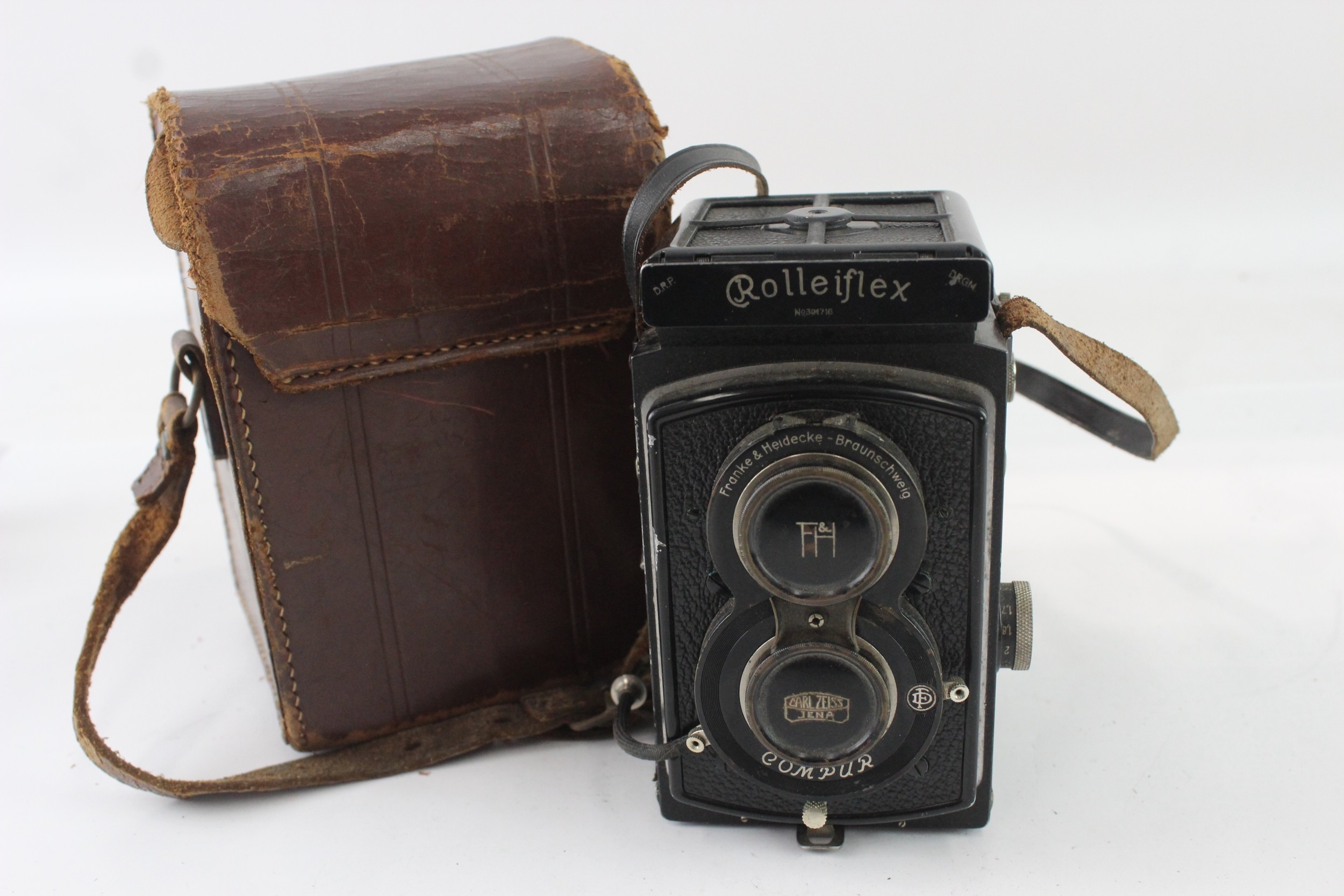 A cased mid 1930s Franke & Heidecke Rolleiflex 'Old Standard' K2 621 TLR camera for 6x6 images on 120 film fitted with Heidoscop-Anastigmat 1:3.1 7.5cm viewing lens, Carl Zeiss Tessar 1:3.8 7.5cm taking lens and Compur shutter with lens cap