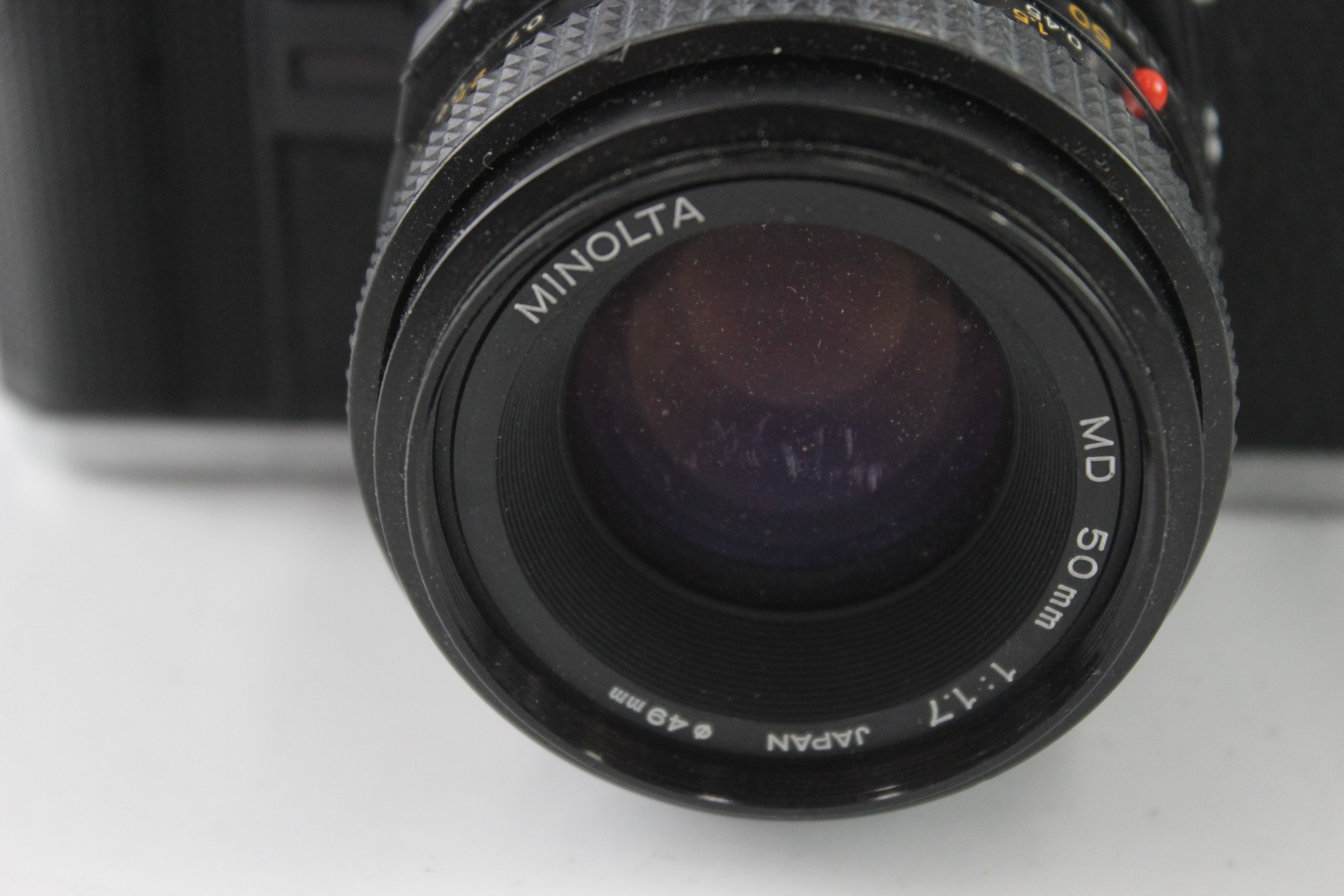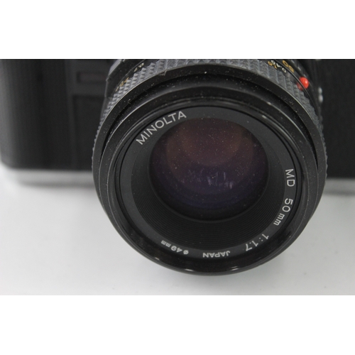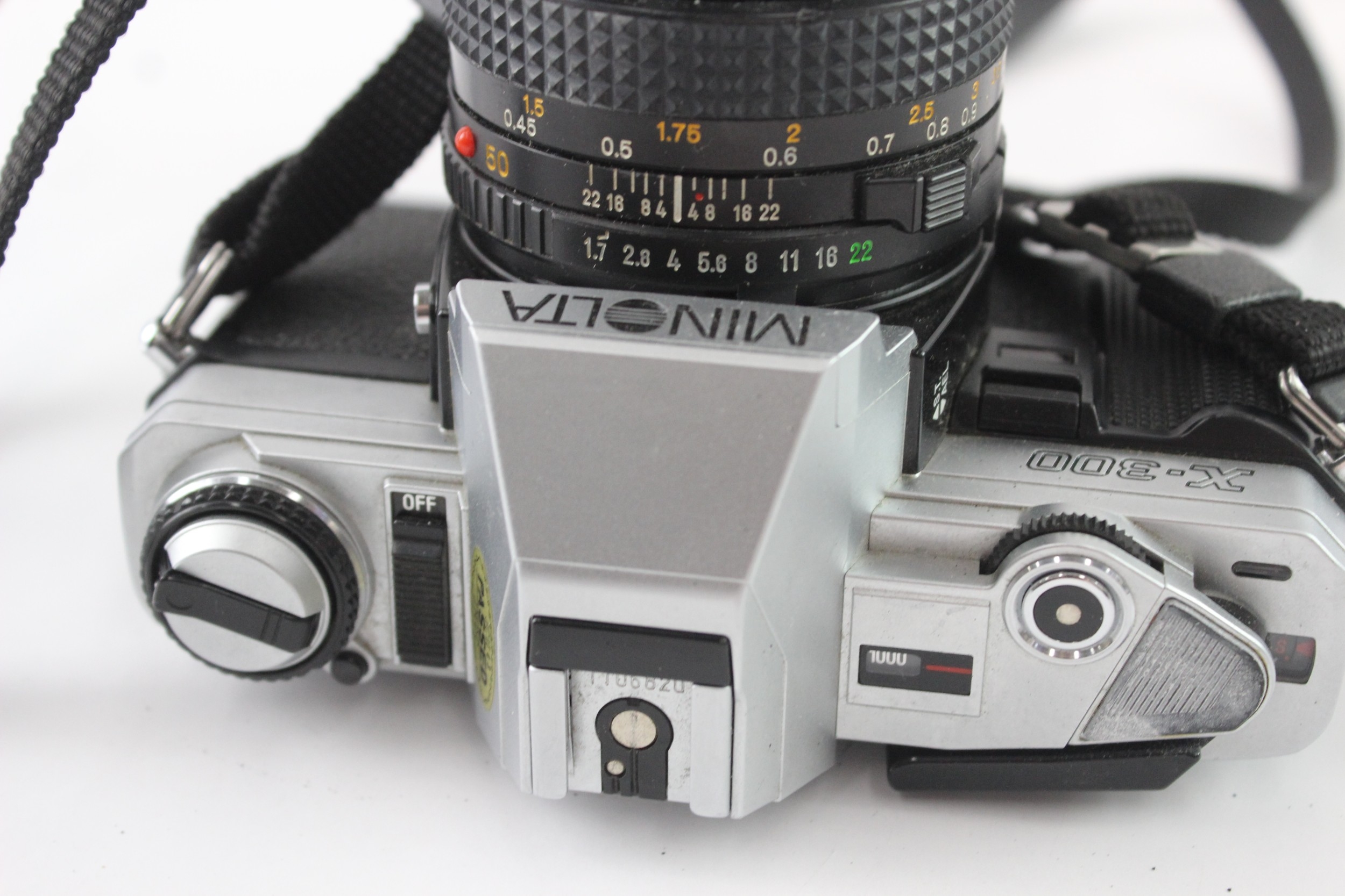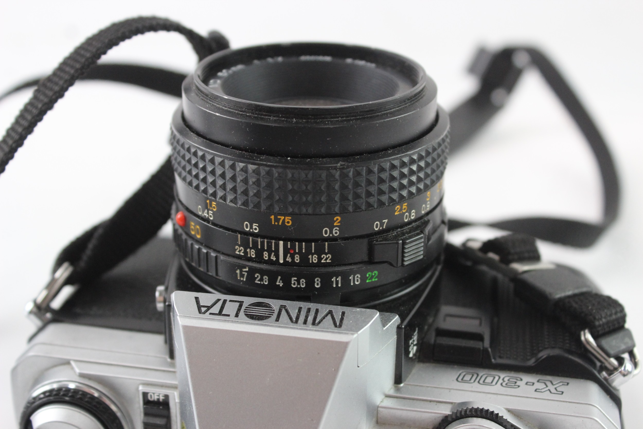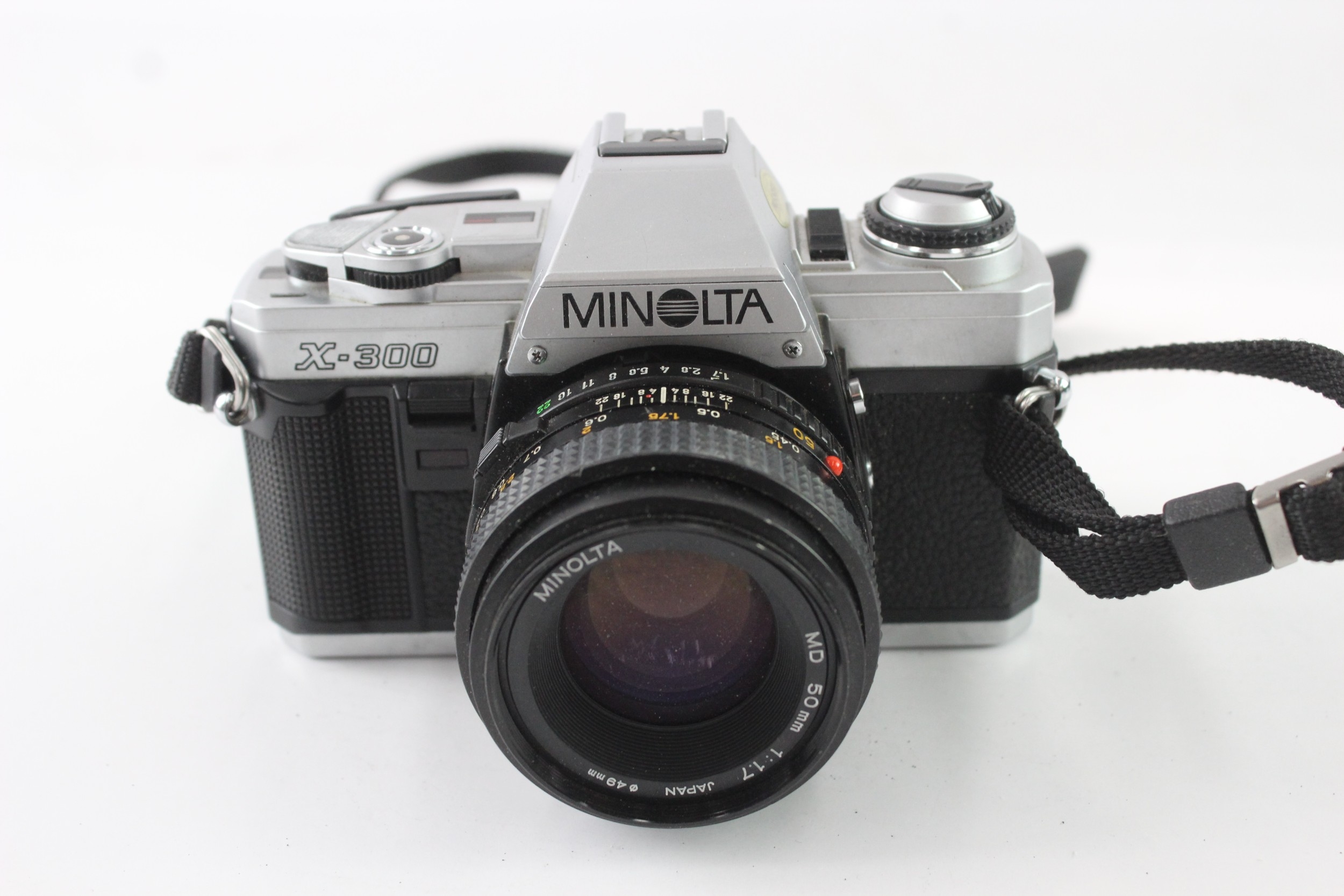 A Minolta X-300 35mm SLR camera fitted with MD 1:1.7 50mm lens