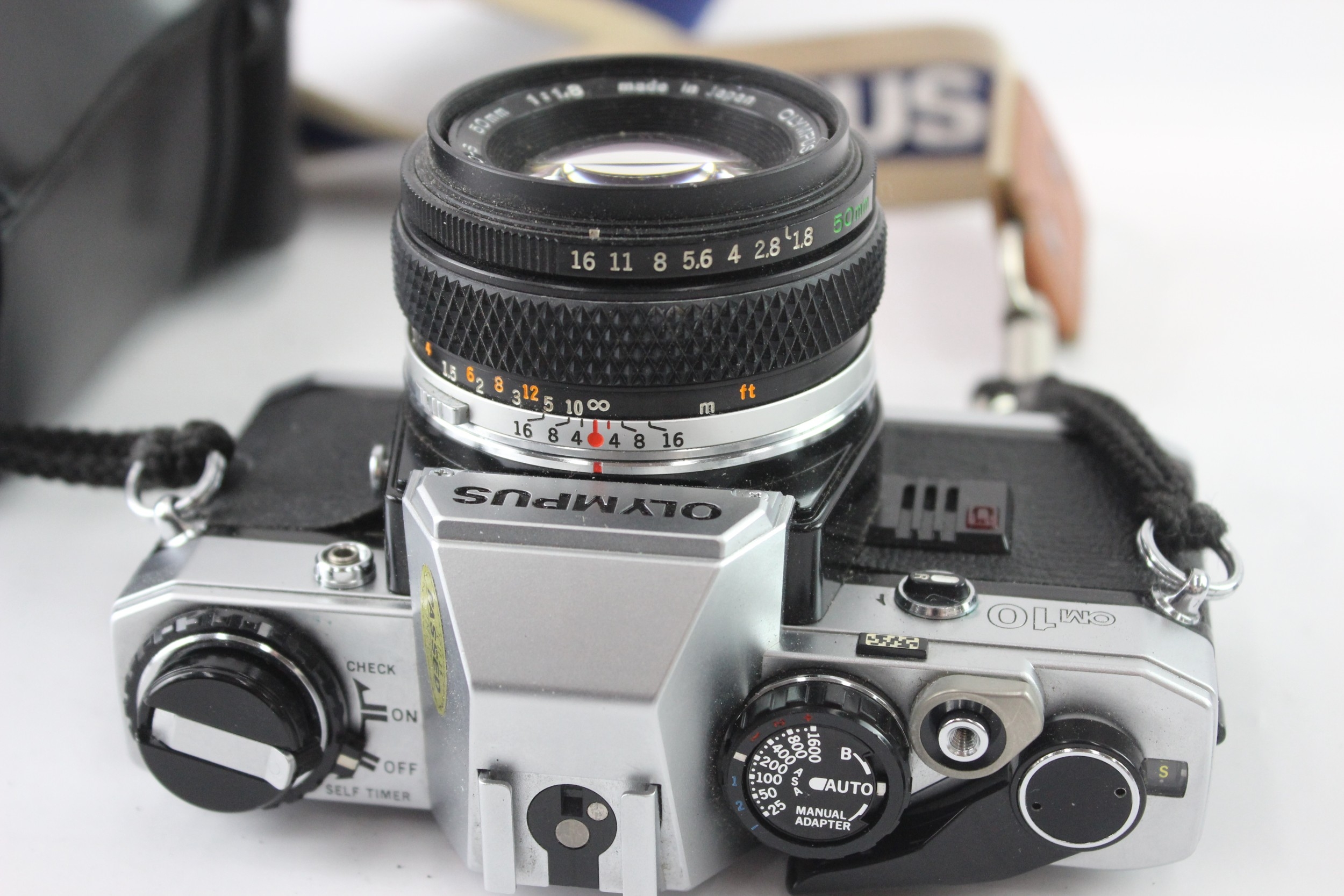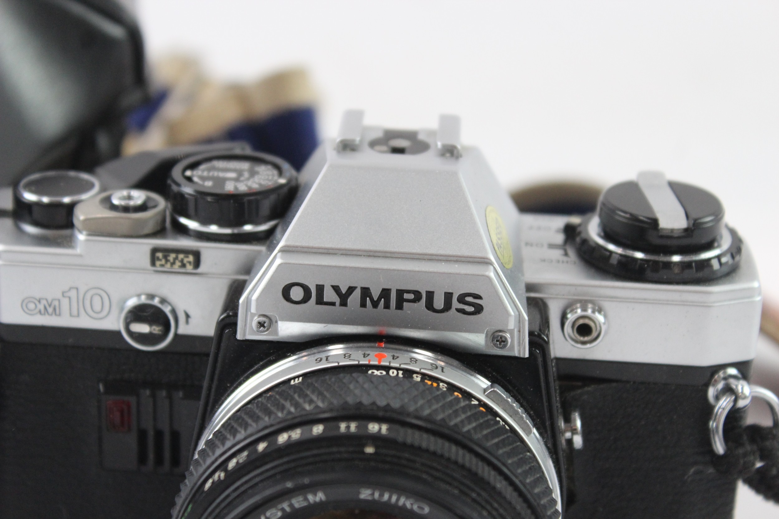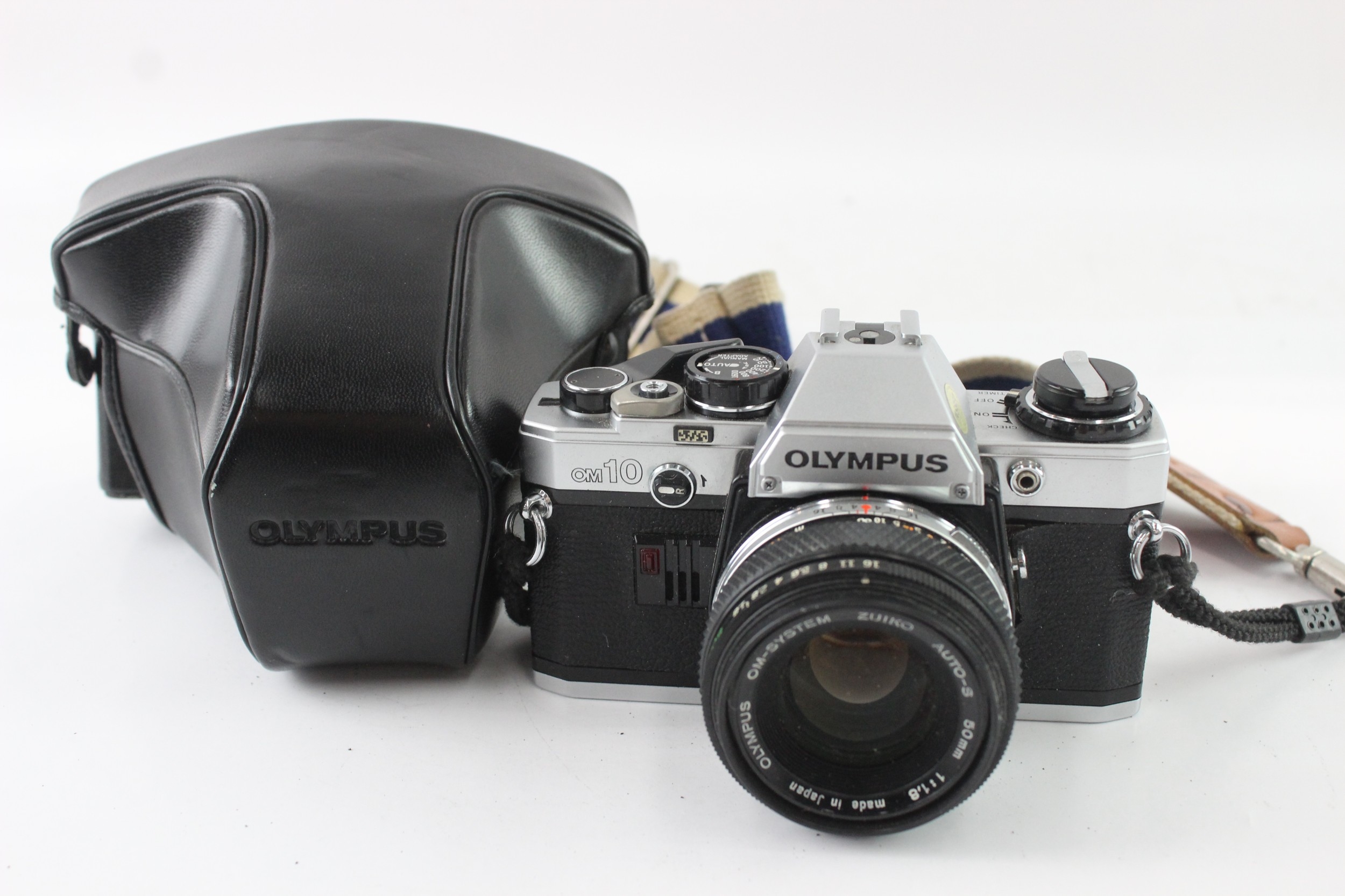 A cased Olympus OM10 35mm SLR camera fitted with Zuiko Auto-S 1:1.8 50mm lens and Olympus strap