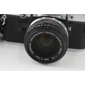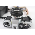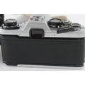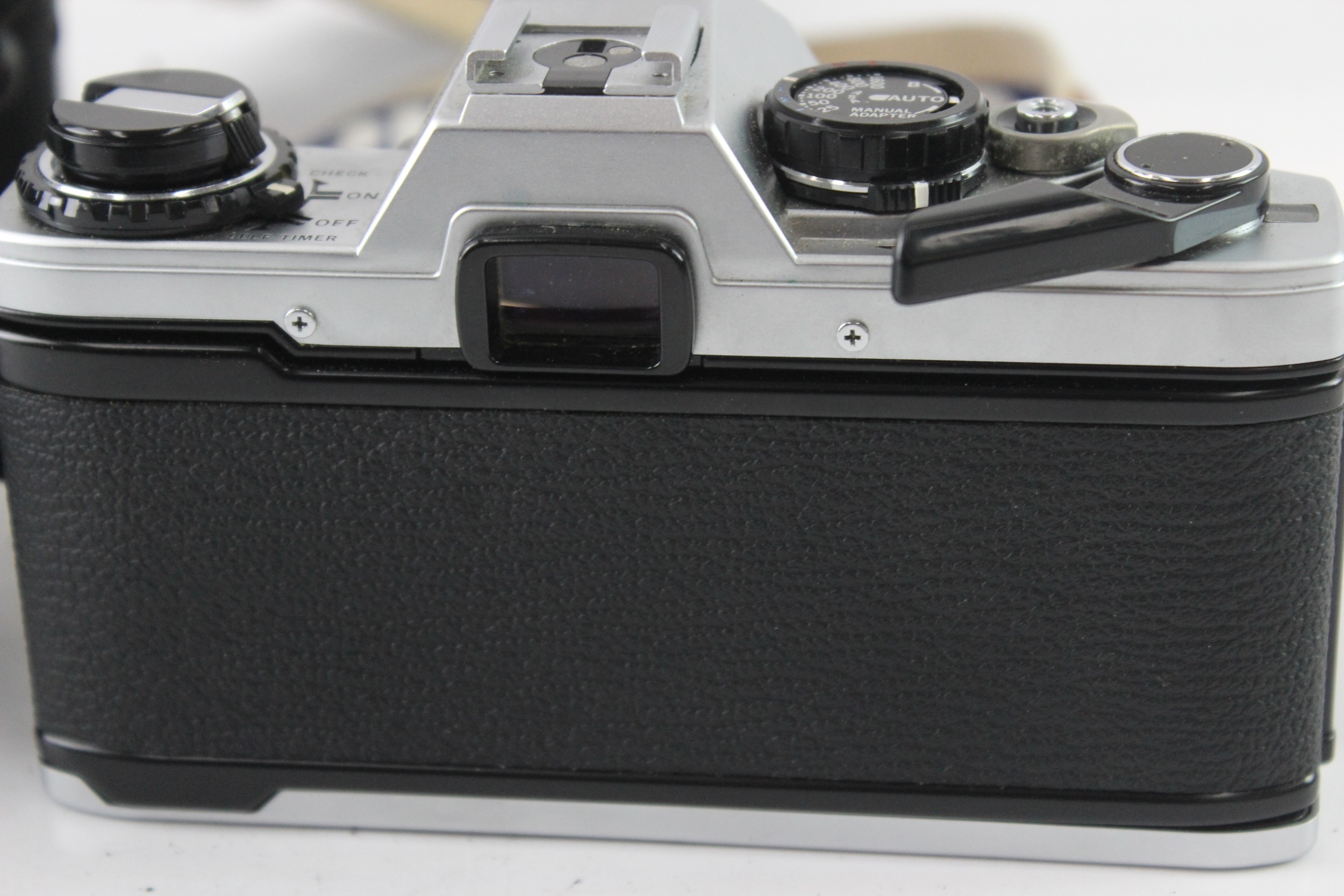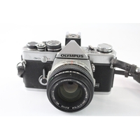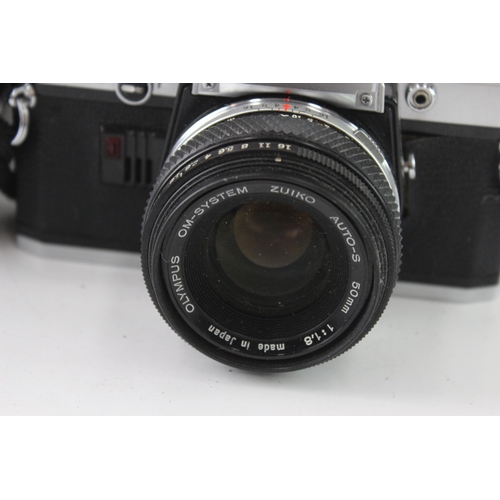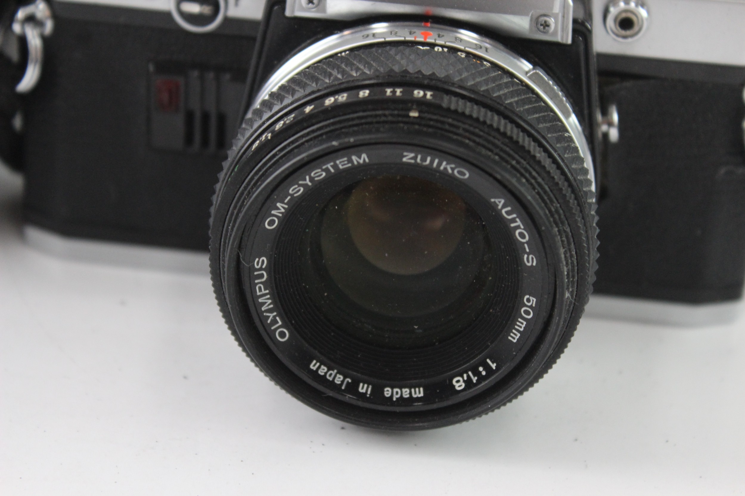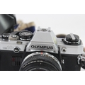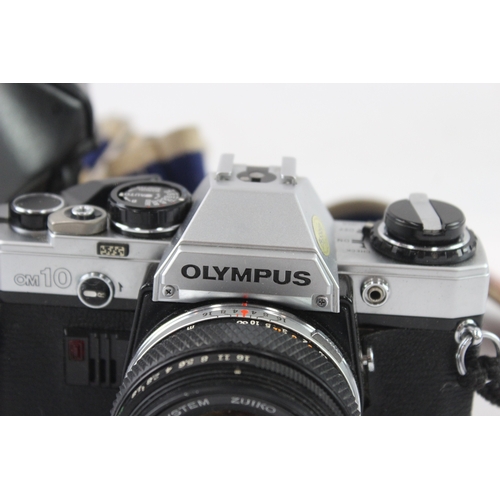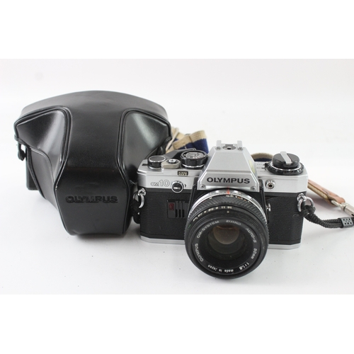 A cased Olympus OM10 35mm SLR camera fitted with Zuiko Auto-S 1:1.8 50mm lens and Olympus strap