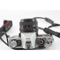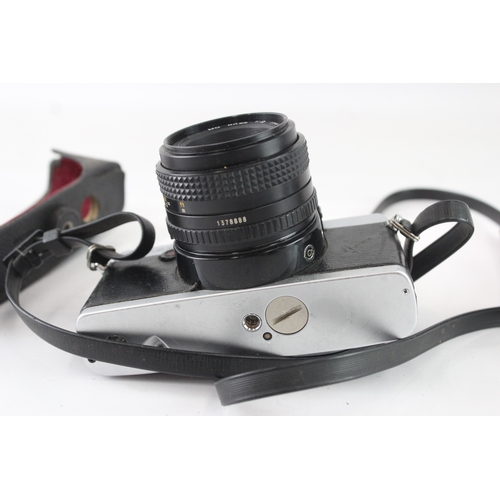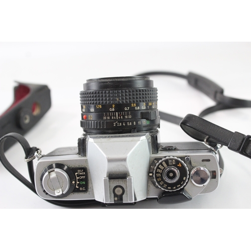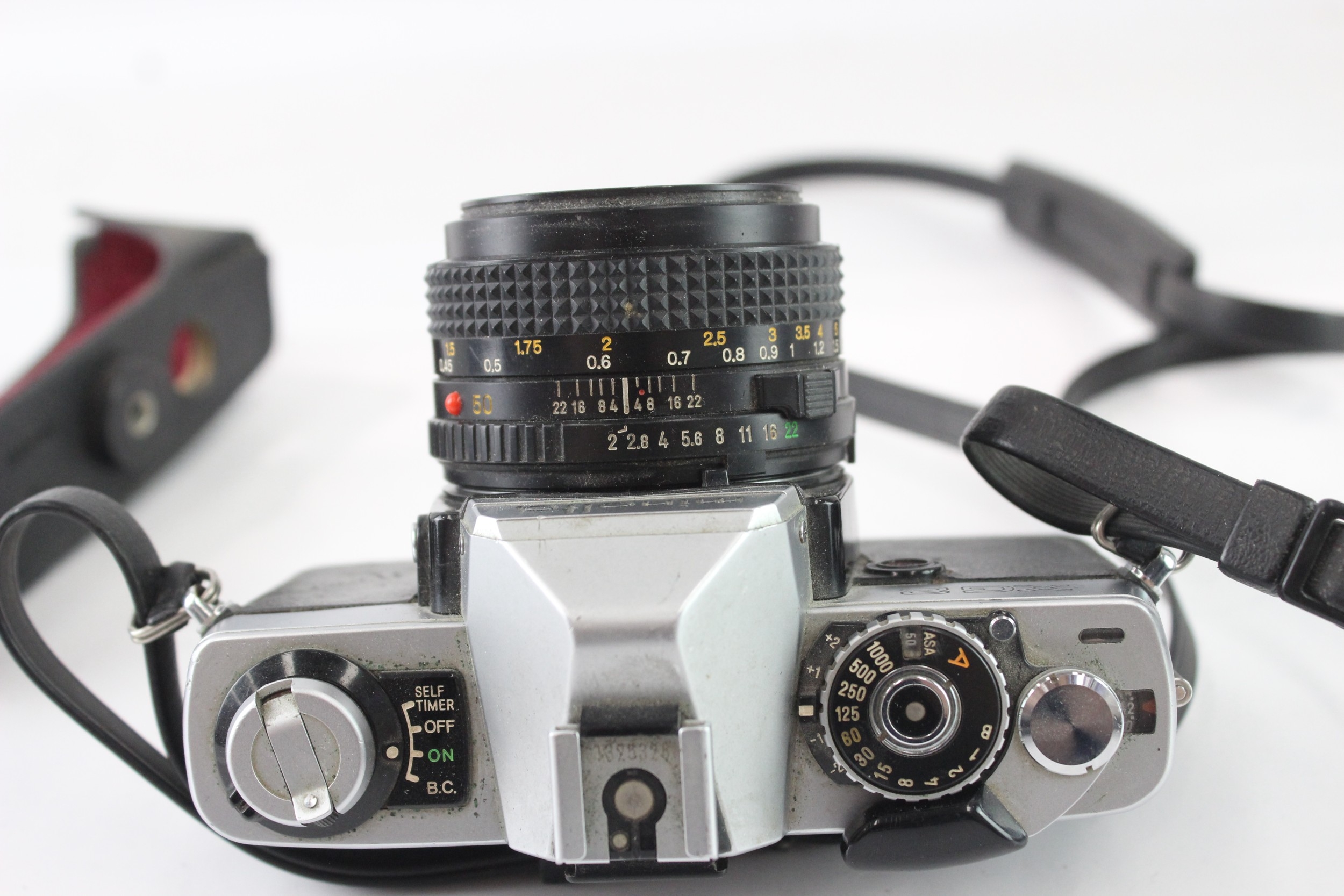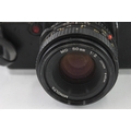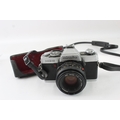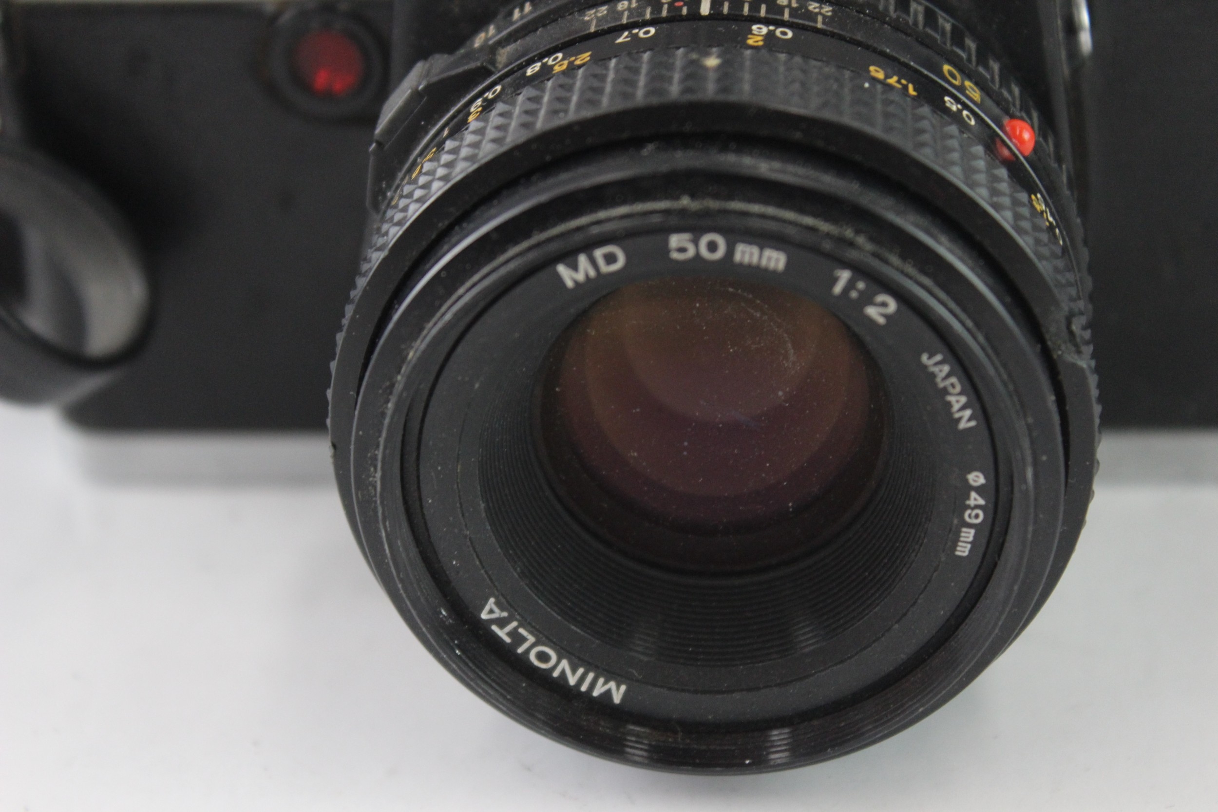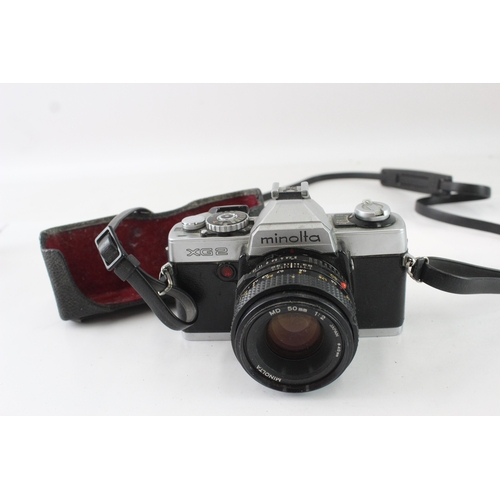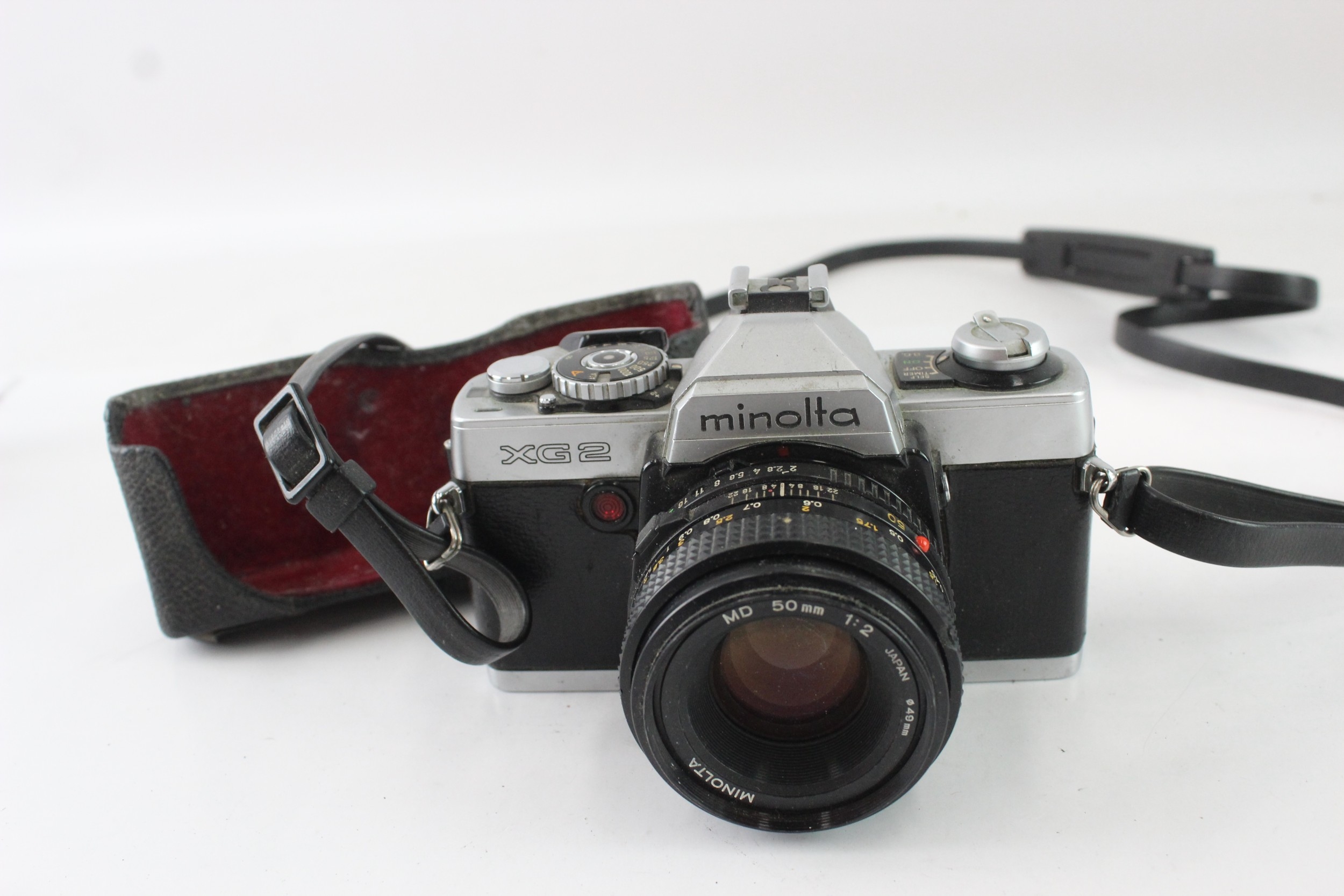 A part-cased Minolta XG2 35mm SLR camera fitted with MD 1:2 50mm lens